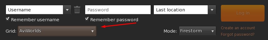 Once you have created the avatar account in the page https://beta.aviworlds.com/auth/register, enter your fist and last name in the field, your password and part of "Grid" select "AviWorlds Beta".